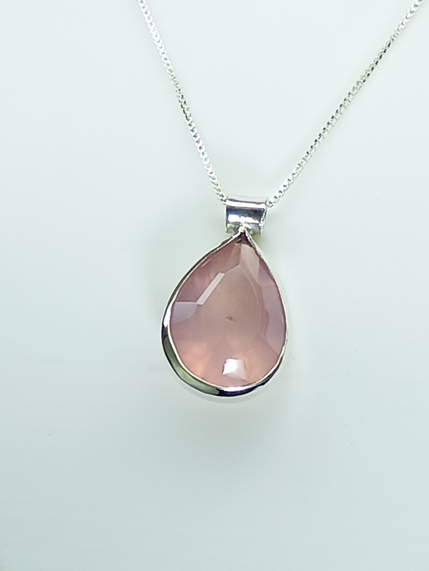 Confeccionado em prata legítima 950, o pingente apresenta uma pedra natural Quartzo Rosa em formato gota facetada, que reflete a luz com brilho suave e feminino.